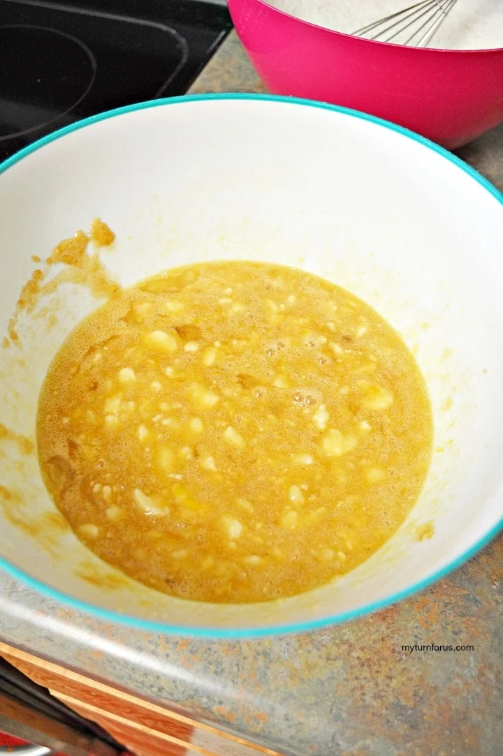 In another large bowl, grab those overripe bananas and mash them smooth with a potato masher (or fork if that’s what you’ve got). Add the brown sugar and stir until it’s completely mixed in and the mixture looks glossy and delicious.