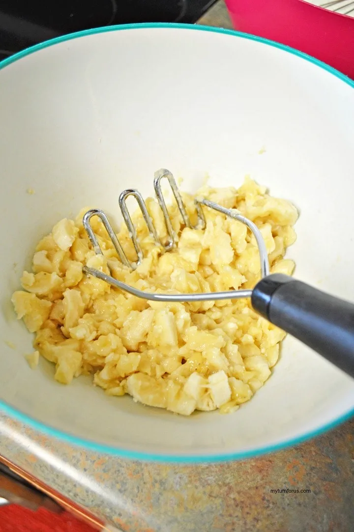 - In another large bowl, grab those overripe bananas and mash them smooth with a potato masher (or fork if that’s what you’ve got). Add the brown sugar and stir until it’s completely mixed in and the mixture looks glossy and delicious.