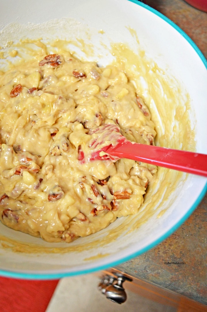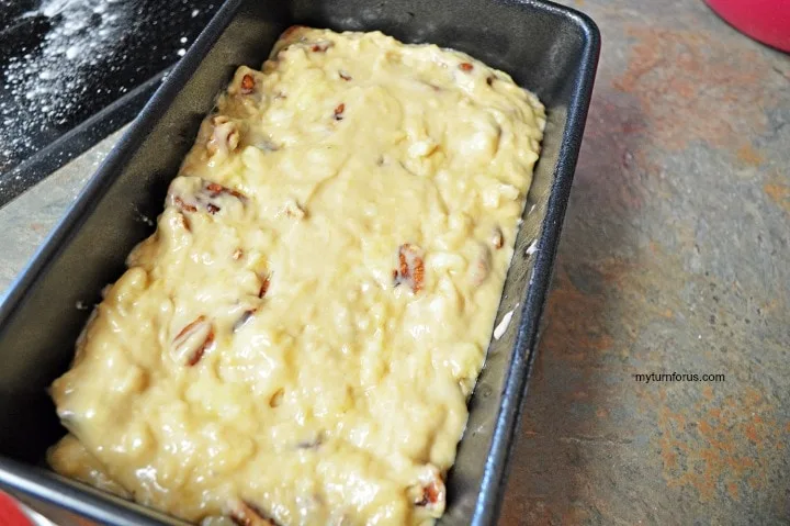 Gradually add the dry ingredients to the banana mixture, stirring gently as you go. Stop mixing the second everything is just combined (a few small lumps are totally fine—overmixing makes tough bread!). Fold in the chopped toasted pecans with a light hand so they’re evenly scattered throughout. That’s it—your batter is ready for the pan!