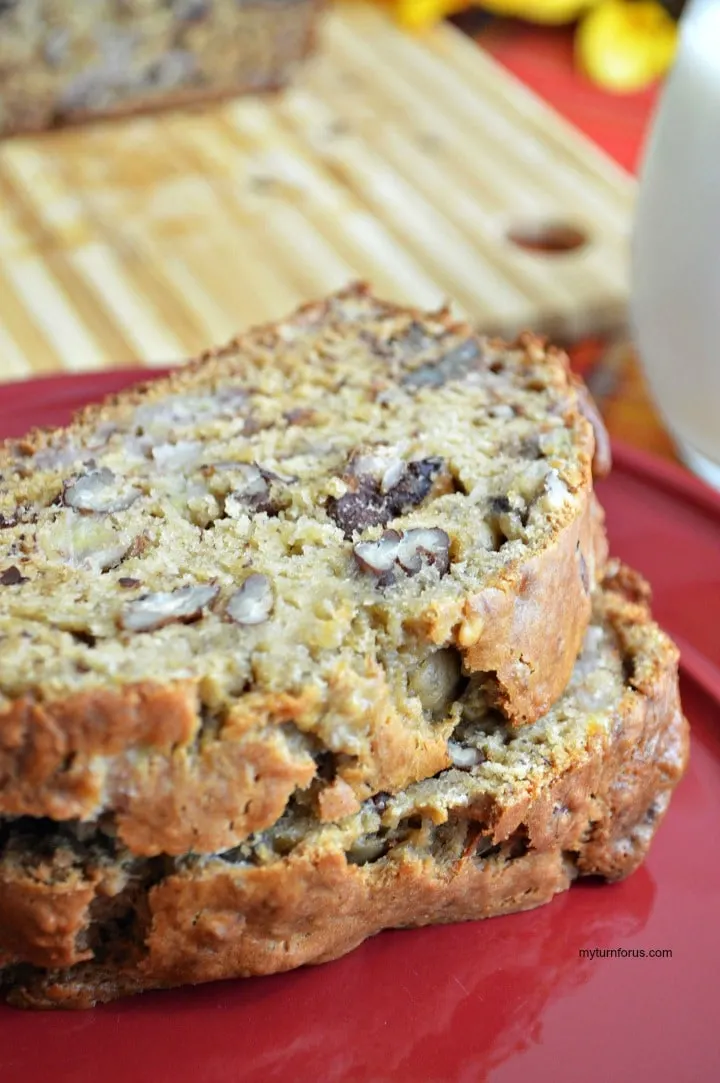 - Let the bread cool, slice this Banana Pecan Bread and serve.