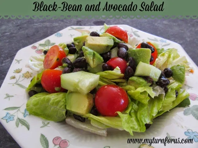1. In a large serving bowl, combine romaine lettuce, tomatoes, cucumbers, avocado and beans