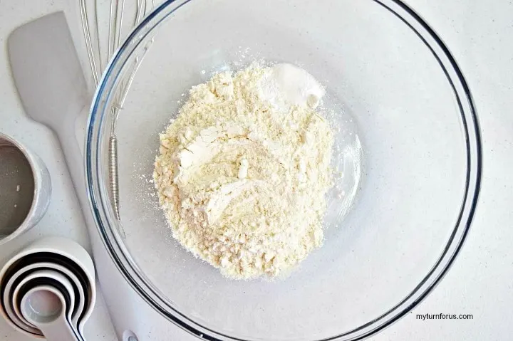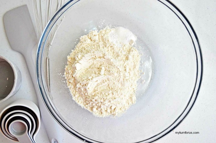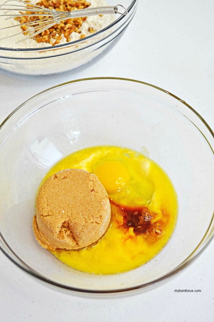 To start this walnut bars recipe preheat your oven to 350 degrees. And spray a 9×9 baking dish with non-stick cooking spray. In a large bowl, whisk together flour, baking powder, baking soda, and salt. Stir in walnuts, set aside.