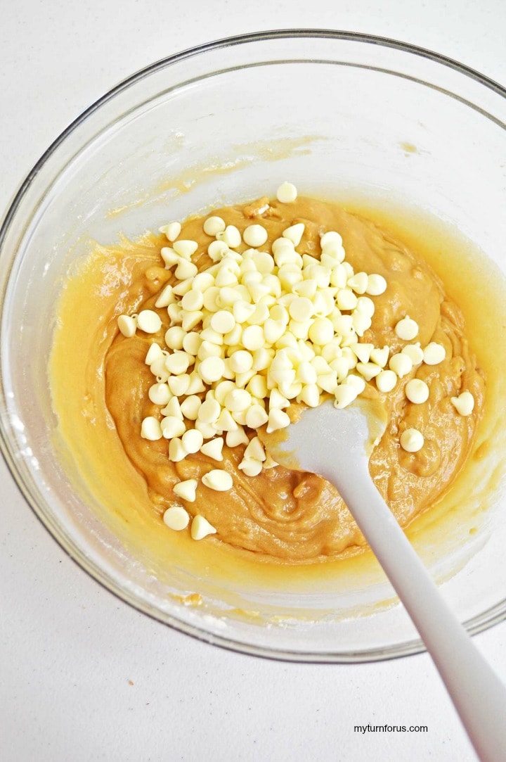 Gently fold in white chocolate chips to your maple brownies mixture.