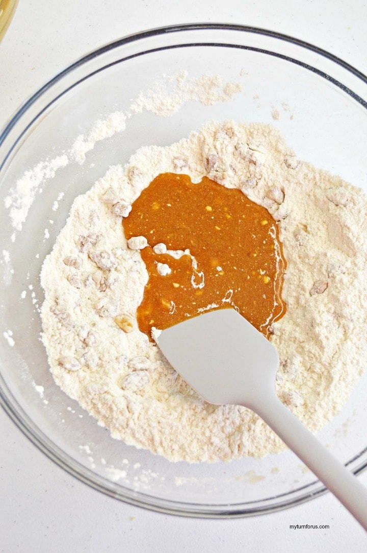 Fold the dry mixture into the wet, mixing until just combined.