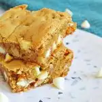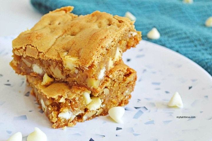 We know you like these easy white chocolate chip blondies. They are perfect for a kid’s snack or even a big kid’s snack. This easy white chocolate chip walnut bars recipe is easy and can be ready in a little over 30 minutes. We all know cookies are great but not as easy to make as pans of blondies and brownies.