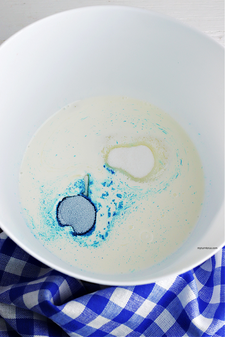 - Add the heavy whipping cream, 1 package of kool-aid and sugar to your large bowl.