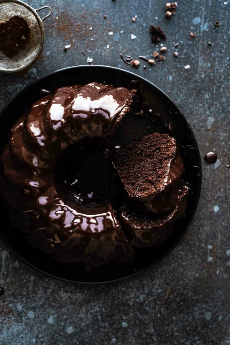This special chocolate bundt cake is made with sour cream and topped with a delicious chocolate ganache.