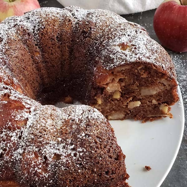 This Bundt cake has a crisp chewy crust, soft moist center, and is filled with sweet apple chunks and warm spices like cinnamon and nutmeg.