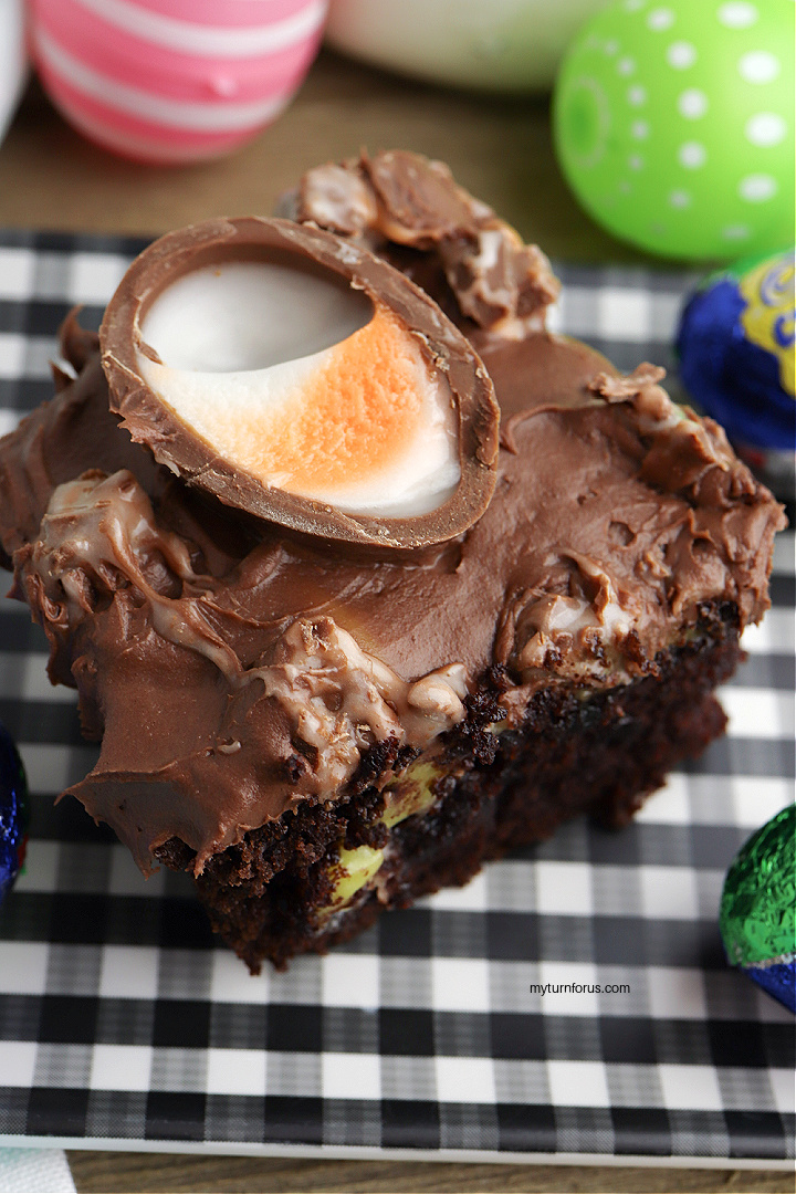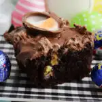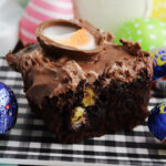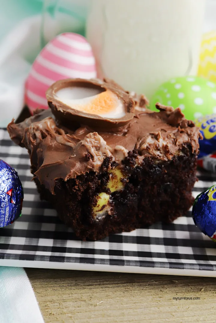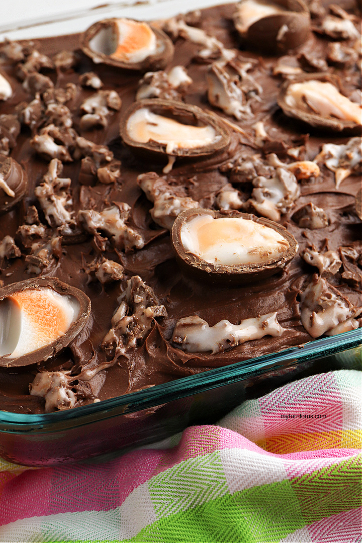 Cut into 12 servings making sure each piece contains a half of a Cadbury Egg on top. We hope you enjoy this special chocolate poke cake.