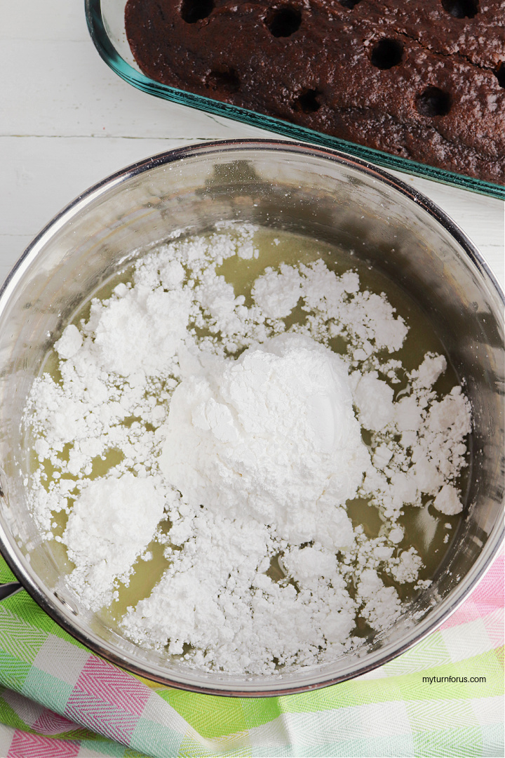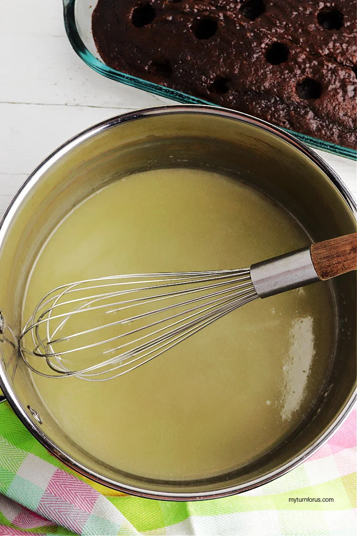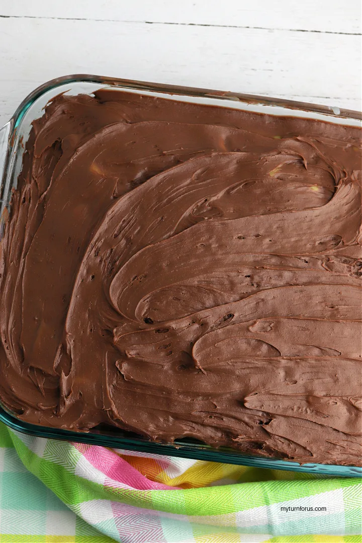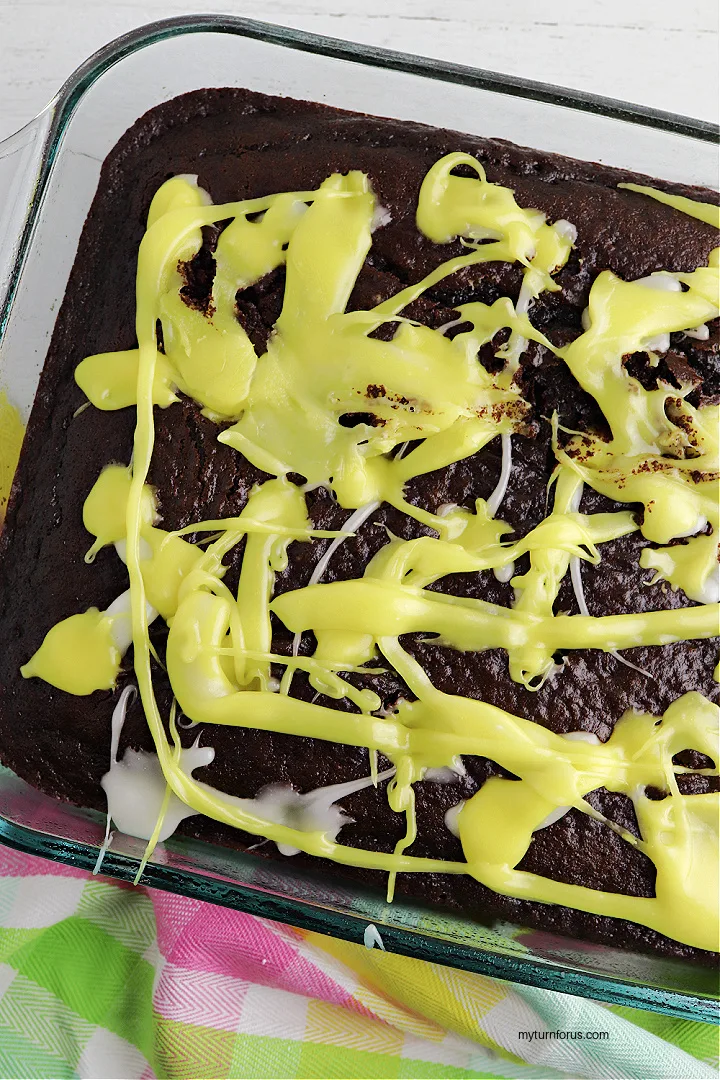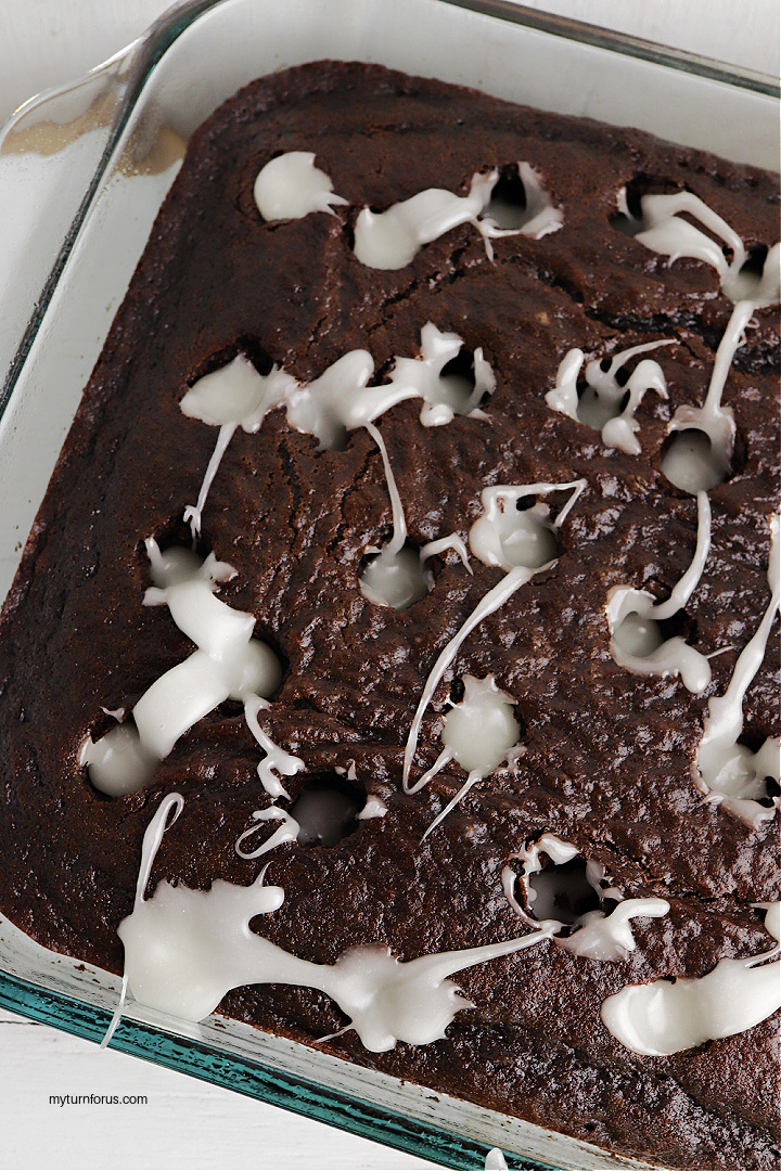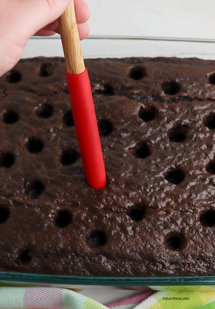 - Prepare and bake the chocolate cake in a 9×13 baking dish according to the package instructions. Allow the cake to cool completely, then use the handle of a wooden spoon to poke holes in the cake.