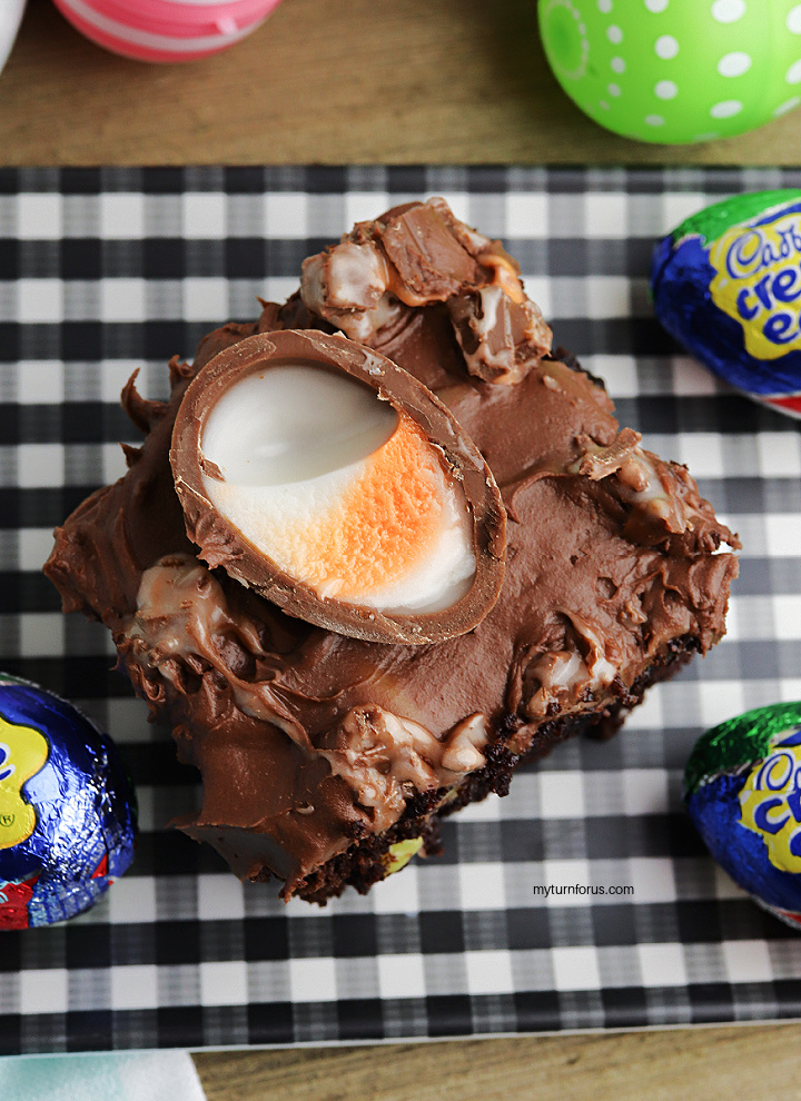 - Cut six of the Cadbury eggs in half and decorate the top of the your Cadbury chocolate cake with the twelve egg halves. Finely chop the remaining eggs and sprinkle the pieces over the top of the cake. Serve