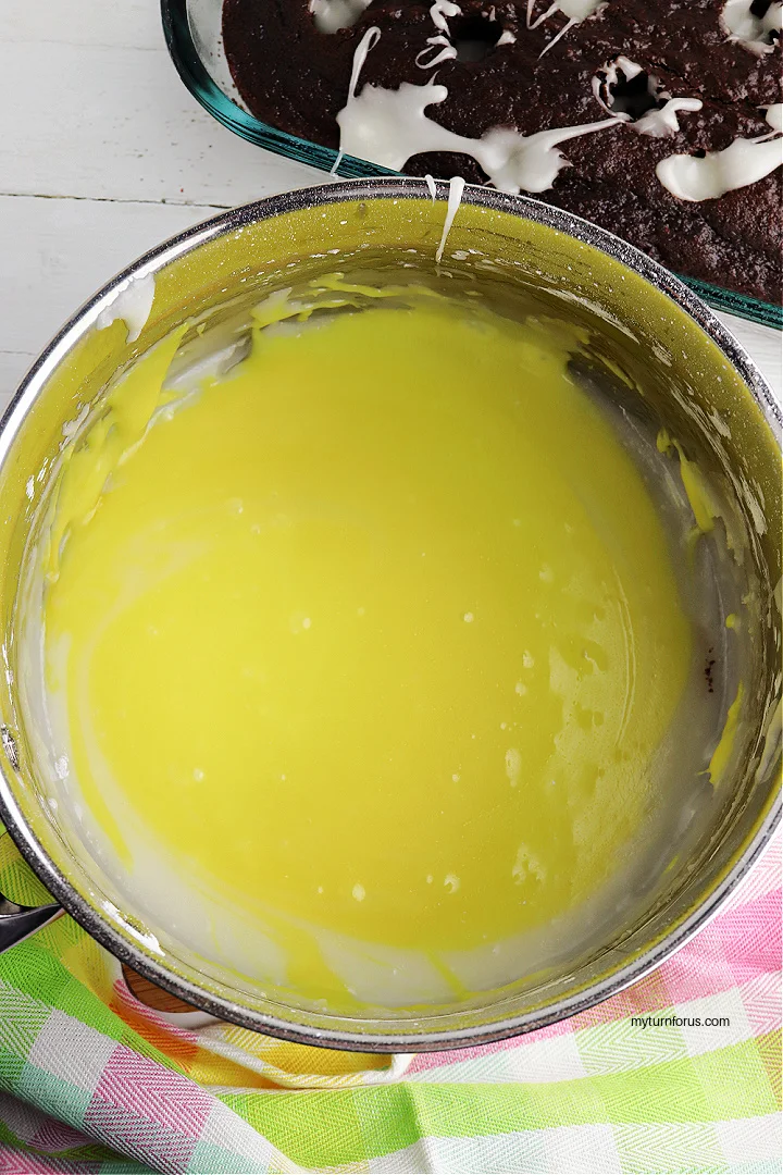 - Spoon the remaining yellow filling over the top of the holes in the cake. Let the cake rest at room temperature for at least one hour, until the filling is set.