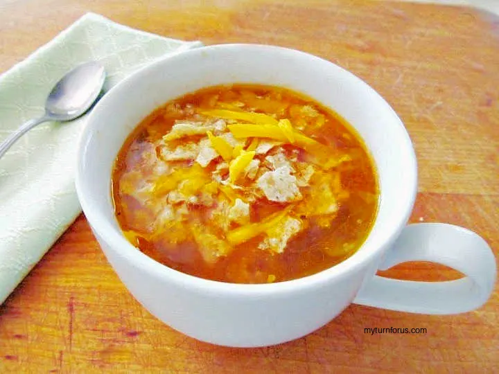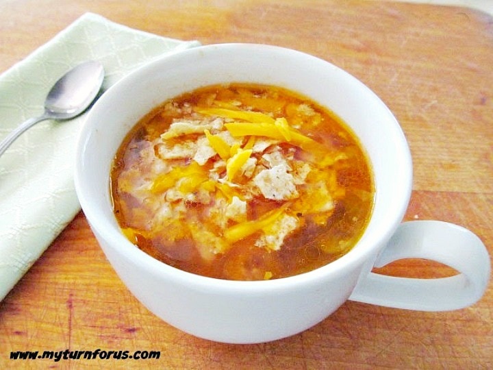 - To Serve: Place 1/2 cup of the tortilla chips in each serving bowl, Ladle the soup over the chips and garnish with the cheese, some of the extra broken chips and minced green onions (optional)
