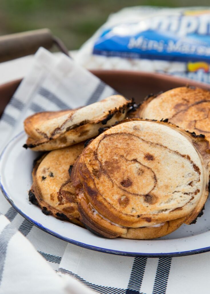 Here is another recipe using Pie Irons! These Smores Pudgy Pies – by Jelly Toast make like a toasted s’ more sandwich using cinnamon bread.  These are on our camping desserts gotta try list!Â