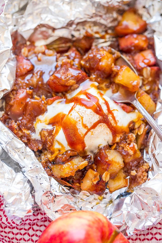 We are drooling over these flavors of caramel and apple in these Caramel Apple Crumble Foil Packs – Averie Cooks.  Who doesn’t love a caramel and apple dessert and the easy cleanup of campfire desserts in foil