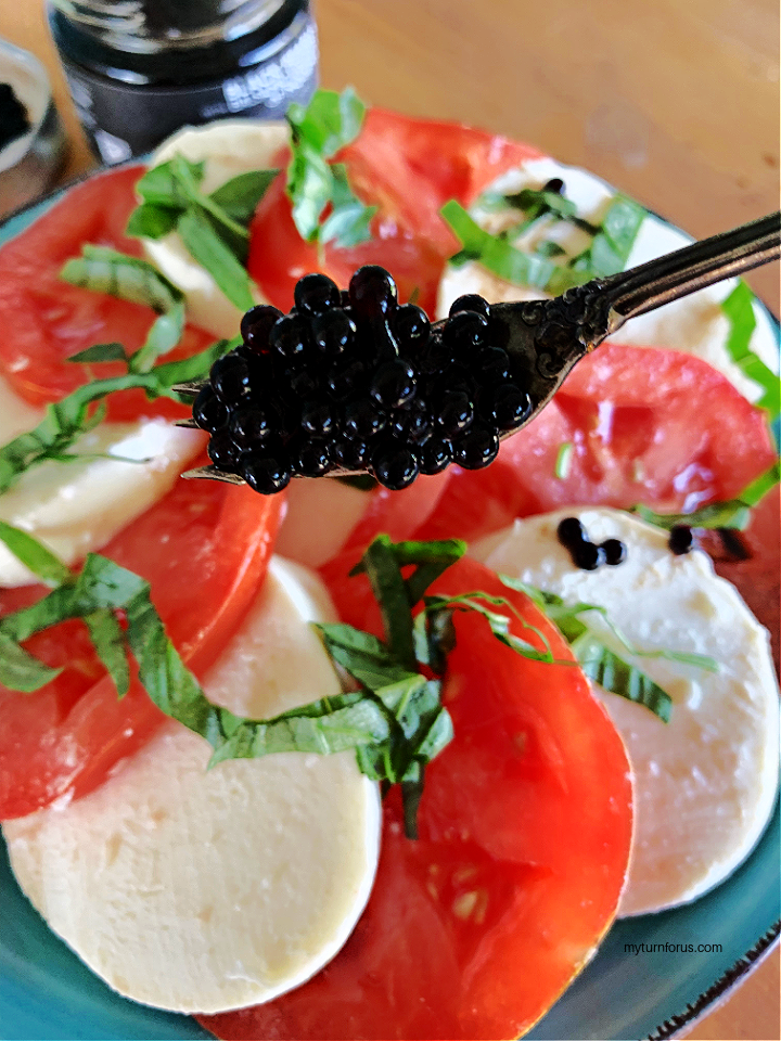 A delicious twist to this classic salad is topping it with Balsamic Pearls. These Balsamic Pearls are created from 8-month aged balsamic vinegar. These Balsamic Pearls go through a special process to be transformed into small jelly balls with a thin outer layer and a juicy core. In this way, vinegar returns to its initial shape; to grapes’ rounded shape, that bursts in your mouth releasing its unique flavor. And Balsamic Pearls upgrades a caprese salad with a unique flavor and colorful beauty.