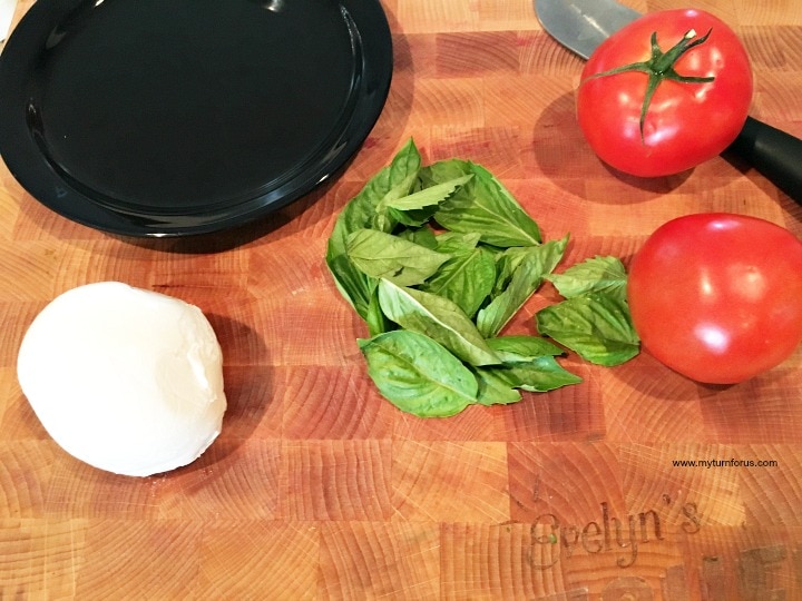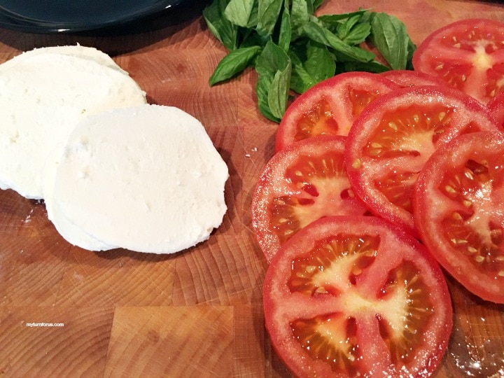 Slice the fresh tomatoes into quarter-inch or half-inch slices. Then use a sharp knife or a Mozzarella cheese slicer to slice the cheese.