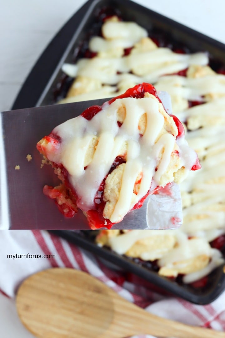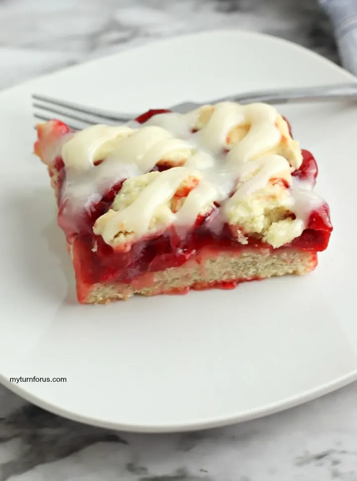 Now what could be more American than apple pie? Cherry squares that’s what. These scrumptious treats are one of our favorite pastries and it’s one of the easiest to make. There is no reason to go out and buy a mix nor a prepackaged pastry. You can have make your own with this Cherry Square recipe. And it’s topped with a cream cheese glaze that is out of this world. These cherry square is made using a homemade recipe and can be ready to eat in under an hour. You could serve these cherry squares for breakfast, brunch, after school snack or even as a dessert.