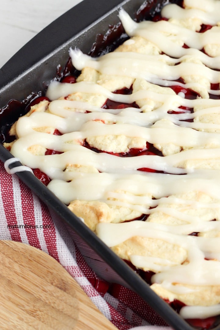 - When the cherry squares are cooled completely, drizzle the cream cheese glaze over the top and cut into nine cherry squares