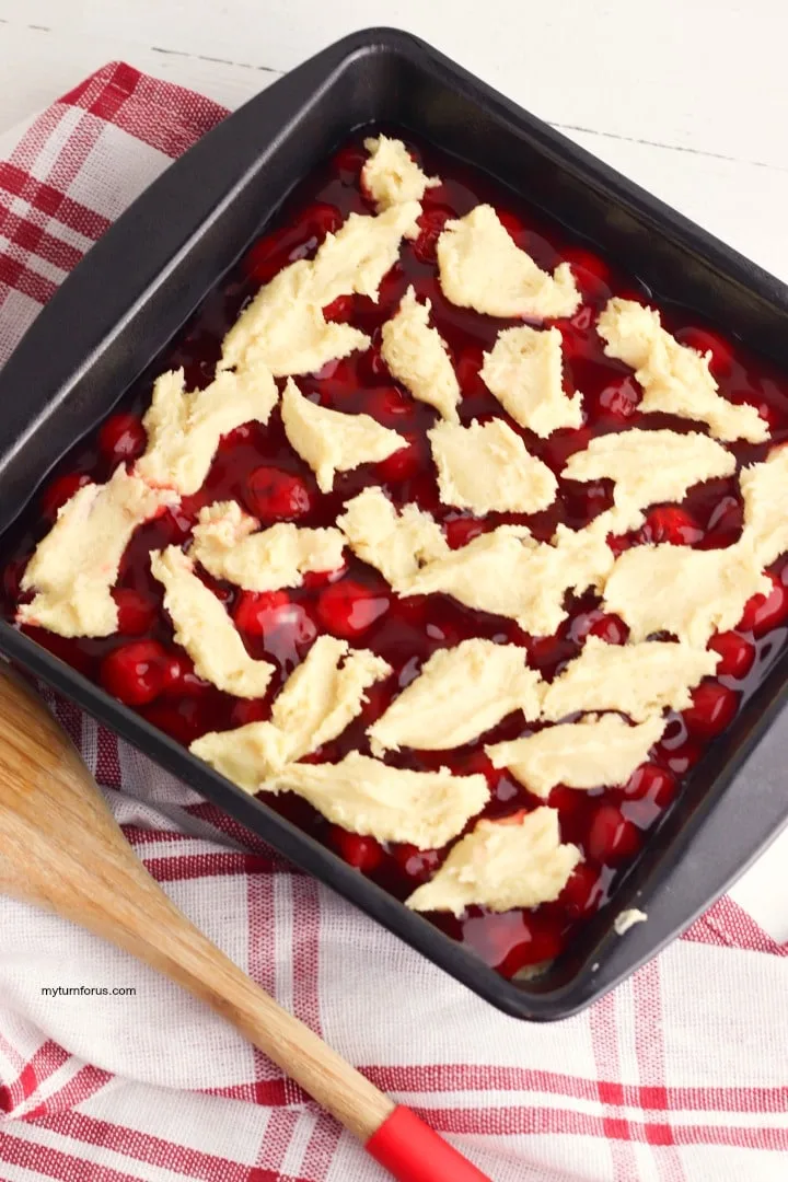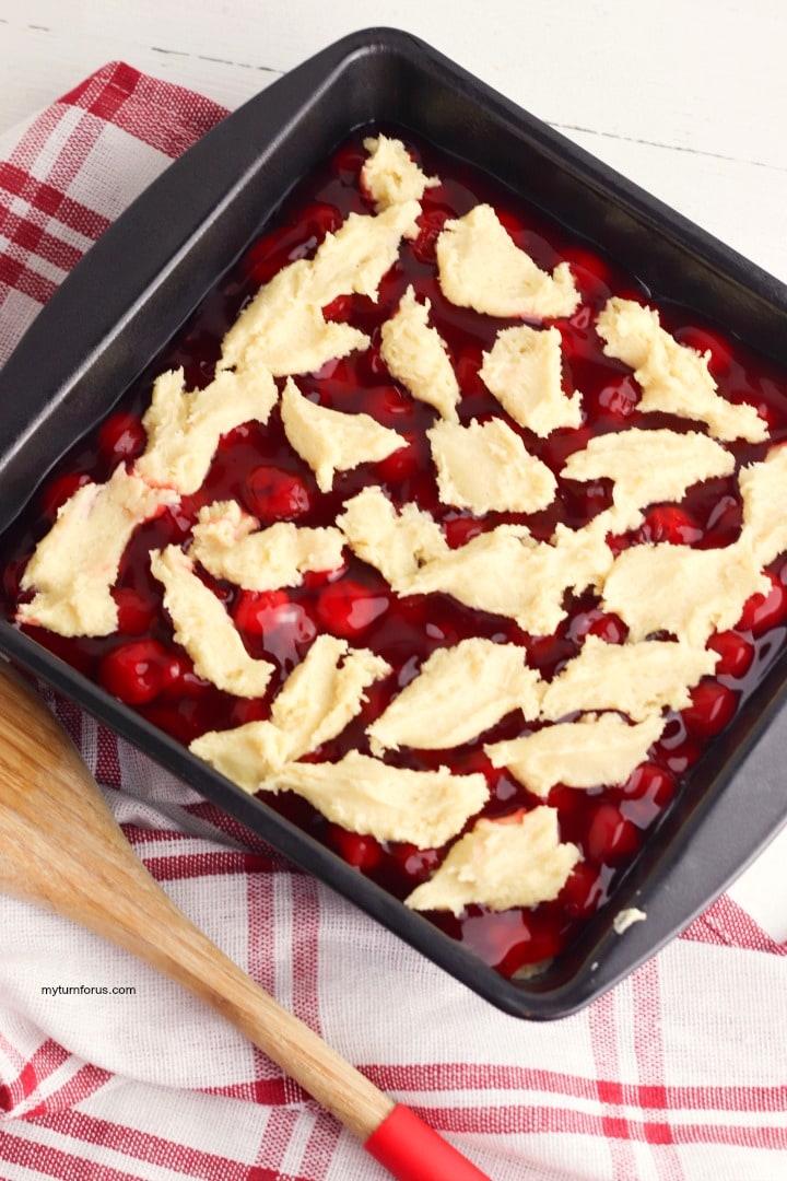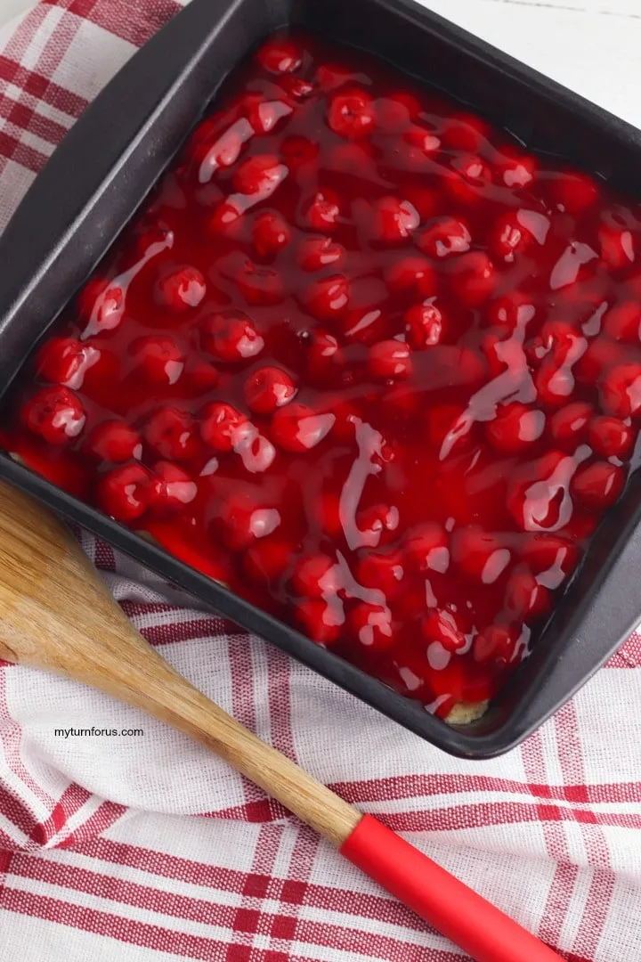 Pour the cherry pie filling over the prepared batter and gently spread evenly.