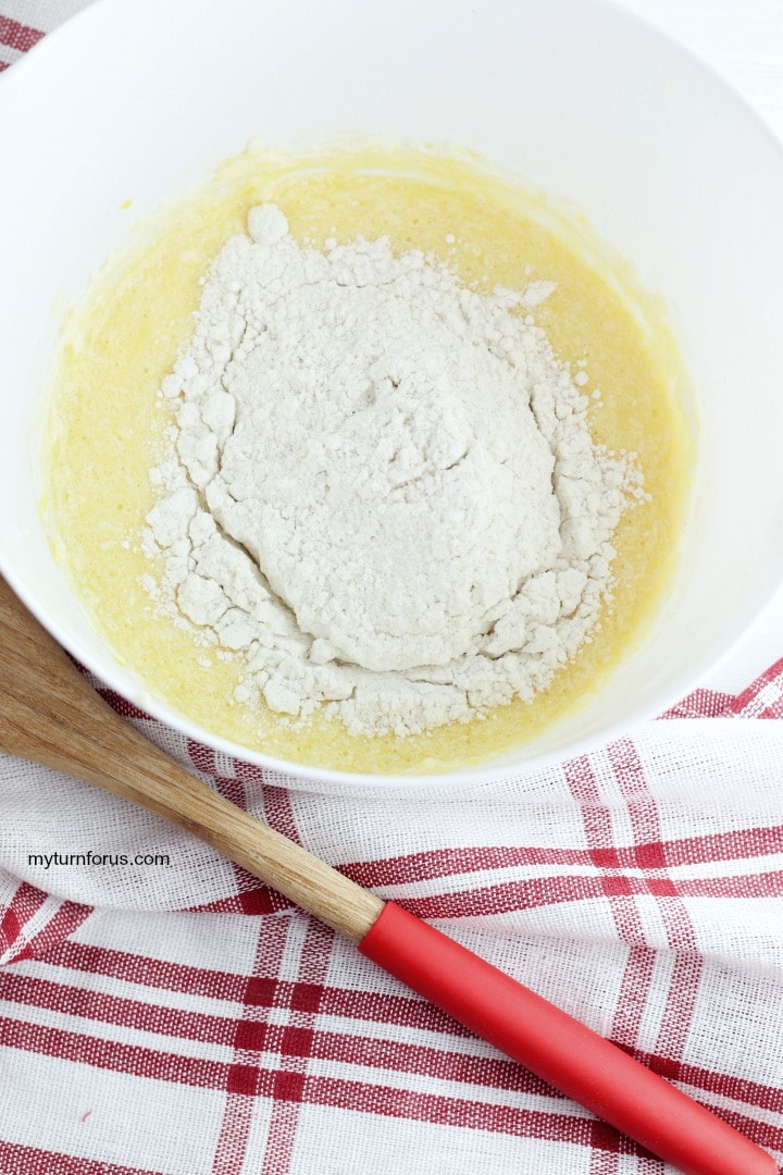 - Add the dry ingredients into the butter egg mixture and mix until very well combined.