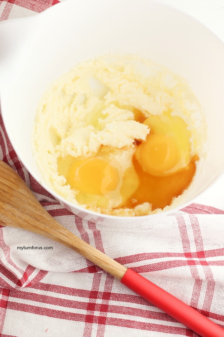 - Beat the butter and sugar together until light and fluffy. Add the eggs and vanilla extract and beat to combine completely.
