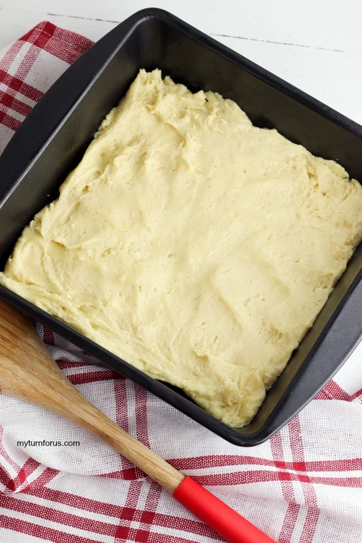 Spread about two-thirds of the batter over the bottom of your 8 X 8 pan. Use your fingers to press the dough into the pan, making sure the dough is spread evenly.