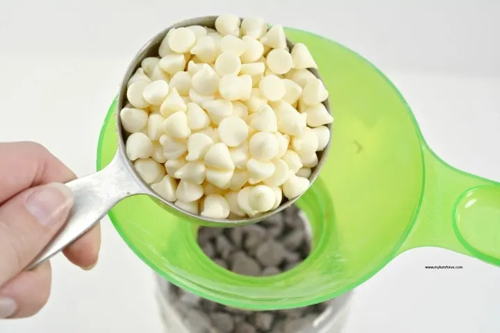 - Pour in ½ cup semi-sweet or milk chocolate chips. Finish with ½ cup white chocolate chips on top. If your jar isn’t quite full to the rim (it sometimes happens depending on chip size), just toss in a few extra semi-sweet or white chips until it’s brimming and beautiful.