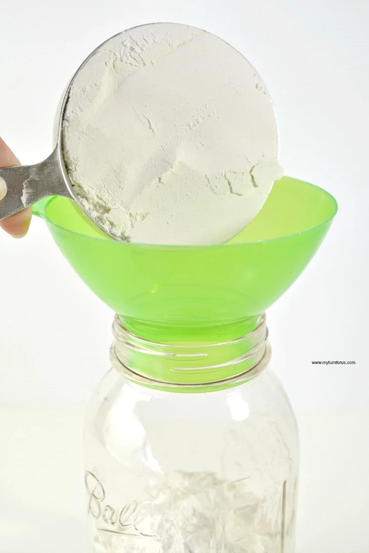- In a quart jar add 1 ½ cups all-purpose flour. Sprinkle in ½ teaspoon baking powder. Add ½ teaspoon baking soda. Finish with ¼ teaspoon salt.
