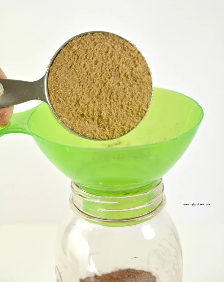 - Pour in ¼ cup white sugar – let it settle on top for a pretty light band. Add ½ cup brown sugar, go slow so it sits right on top of the white sugar. Carefully spoon in ¼ cup unsweetened cocoa powder – creating that dramatic dark chocolate stripe.
