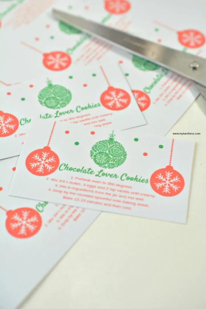 Making a big batch of mason jar chocolate chip cookies? Just print as many sheets as you need! Cut them out, punch a hole in the corner. String a Christmas ribbon, raffia or jute twine through the hole on the tag. Then tie it to the top making it a super cute mason jar cookie mix gift.