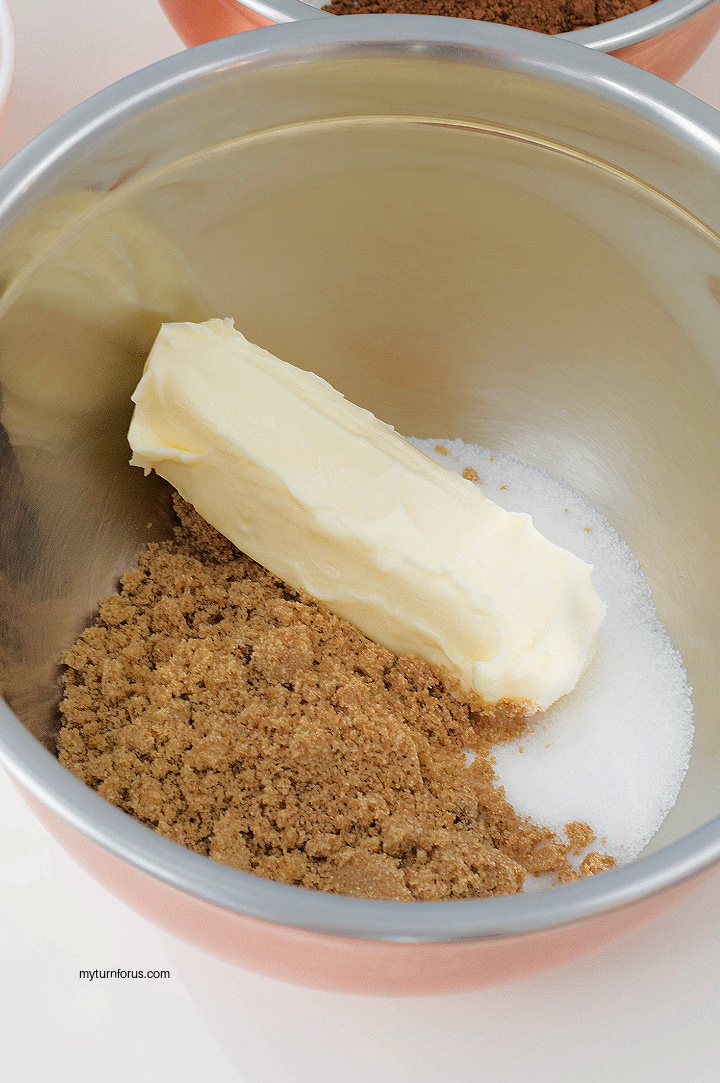 • In a large bowl, cream together butter, both sugars and egg until creamy.