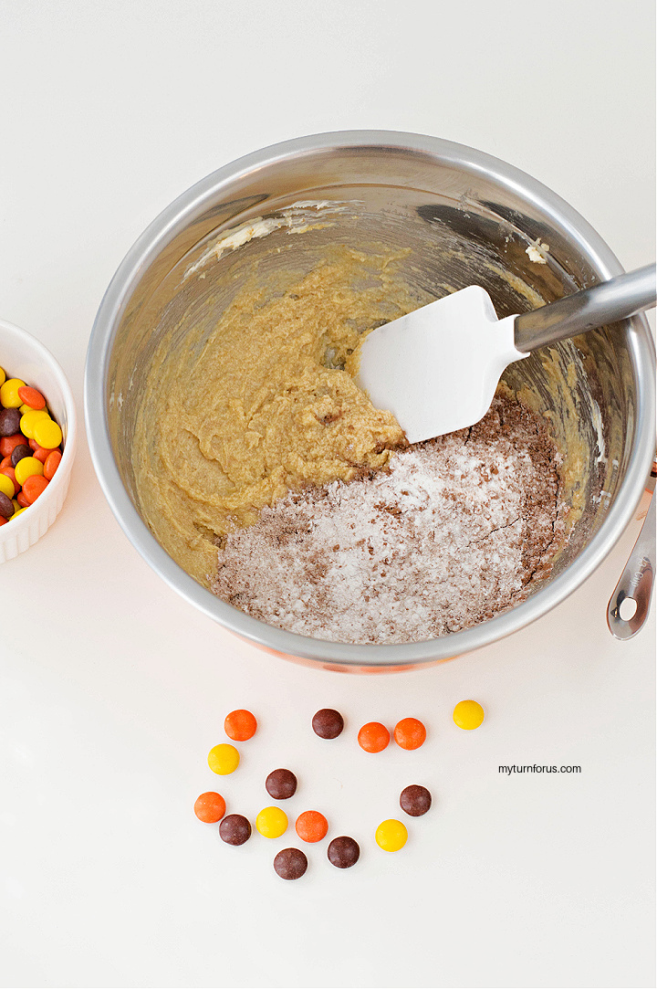 • Slowly add dry ingredients into your bowl of wet ingredients. Mix this sandwich cookie dough with a spatula until everything is thoroughly combined.