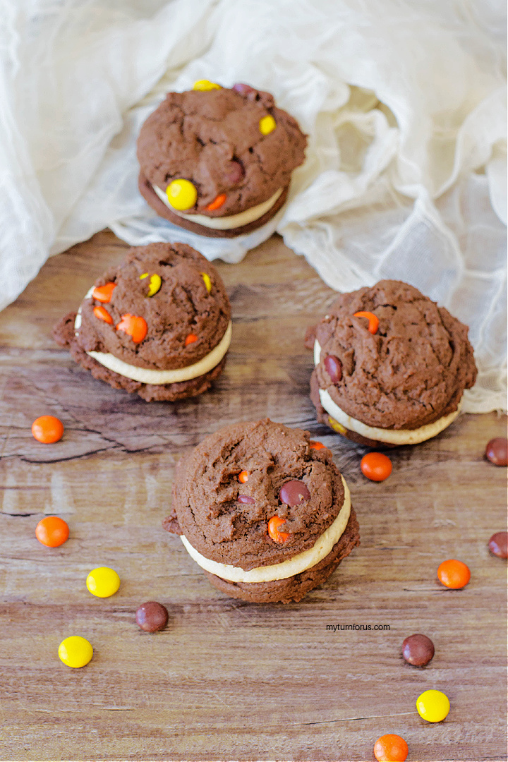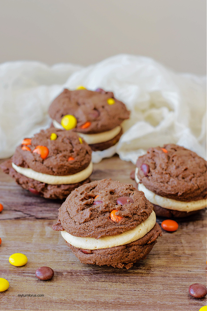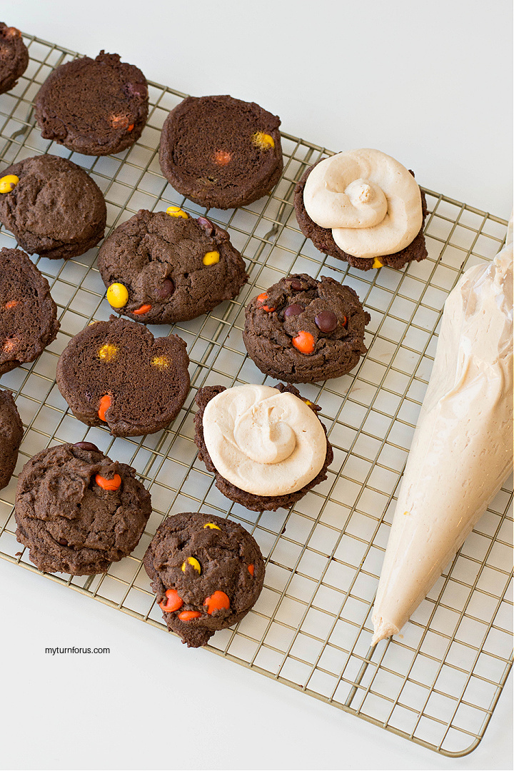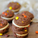 Make Chocolate Peanut Butter Sandwich Cookies. An easy peanut butter buttercream filling sandwich cookie recipe garnished with Reeces Pieces.