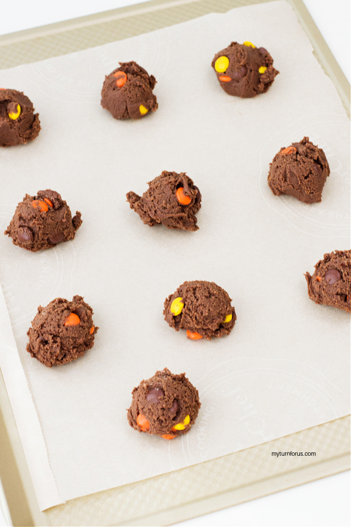 Use an ice cream scoop (about ¼ cup in size), scoop mounds of the chocolate sandwich cookie dough on lined baking sheet, about 1-2 inches apart.  Bake for 10-12 minutes in the preheated oven and cool completely on a wire rack before assembling.