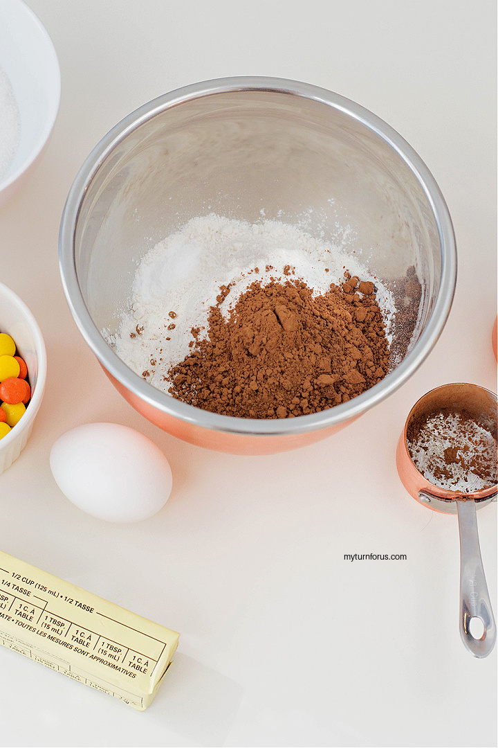 • Line a baking sheet with parchment paper and set aside. Preheat your oven to 350° F. Start your peanut butter sandwich cookies by adding flour, cocoa powder, baking soda and salt in a medium mixing bowl. Stir to combine completely and set aside.