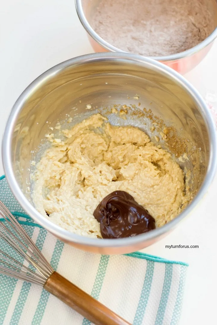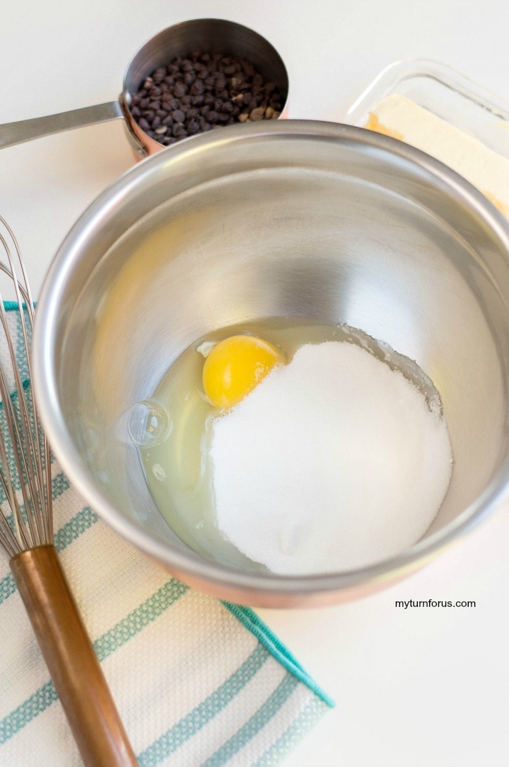 - Add butter and use an electric mixer to beat until smooth. Add melted chocolate chips and mix until all ingredients are well-incorporated and set aside.