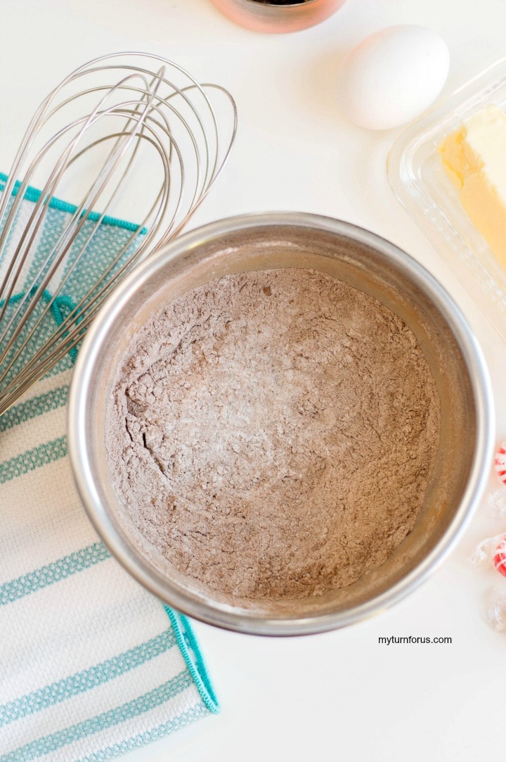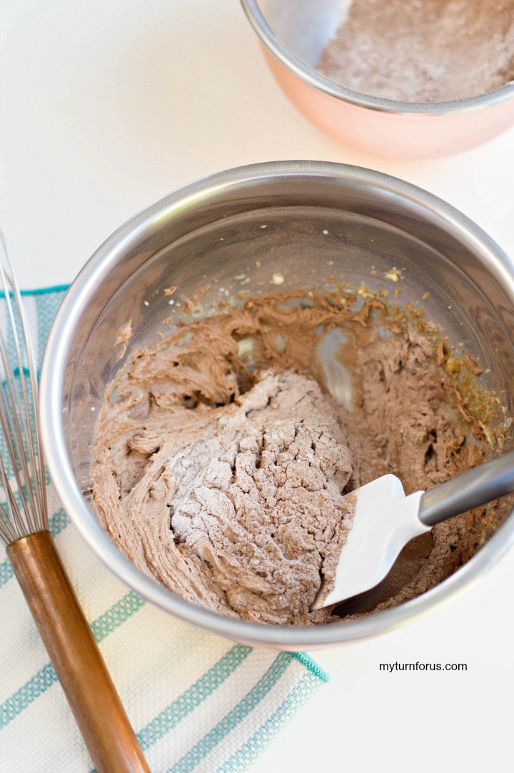 In another bowl, sift together all dry ingredients: flour, cocoa powder, baking soda, and salt.