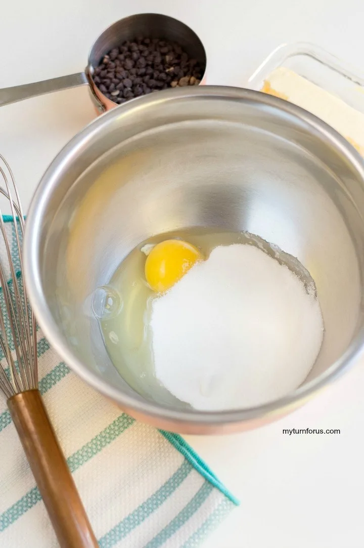Line a baking sheet with parchment paper and set it aside. Preheat your oven to 350 degrees F. Then in a large bowl, cream together egg and both sugars.