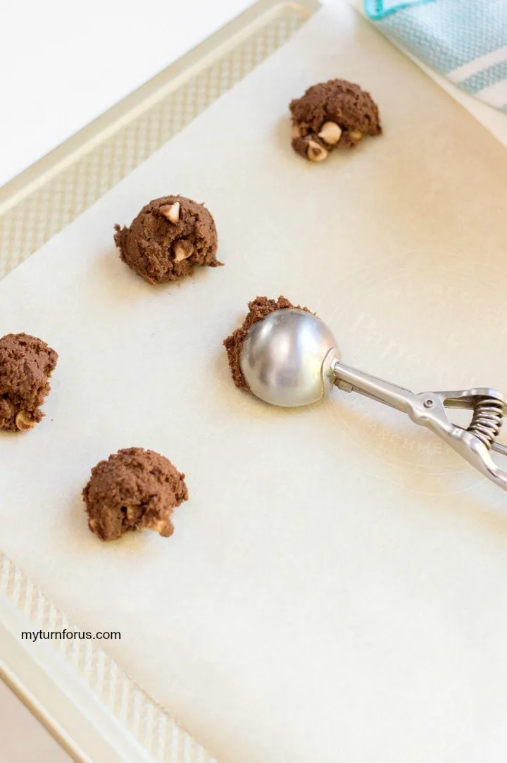 - Use a cookie scoop (approx. ¼ cup) to scoop cookie dough onto the lined baking sheet.