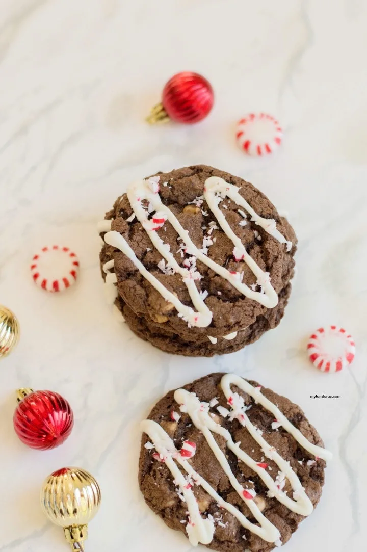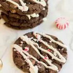 Pour the melted candy melts into a piping bag and drizzle onto each cookie. Then sprinkle each cookie with crushed peppermint. Place on wire racks and allow to cool and the white candy to set before serving
