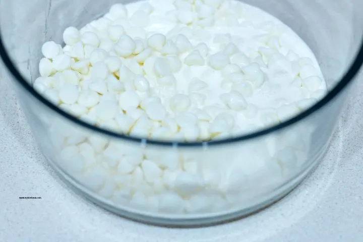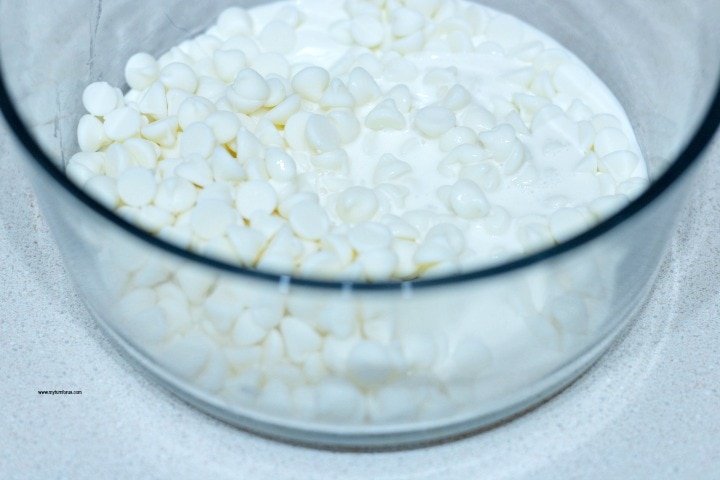 Place the white chocolate chips and heavy whipping cream in a microwave-safe bowl and heat for 40 seconds, stirring every 10 seconds until smooth.
