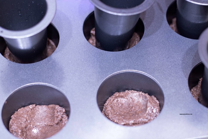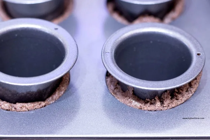 Fill each cup of a cookie shot pan halfway with the chocolate graham cracker mixture.