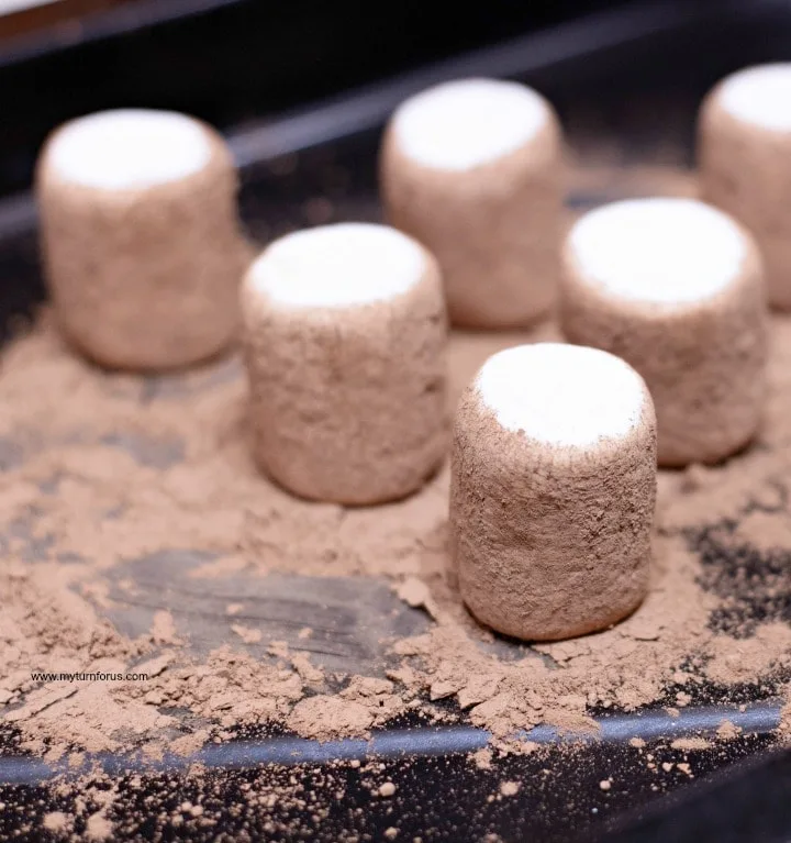 - Roll marshmallows in cocoa powder until well-coated.