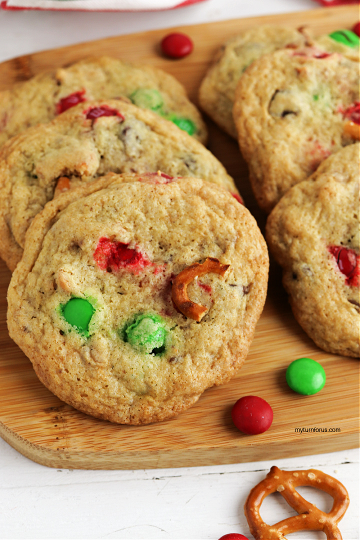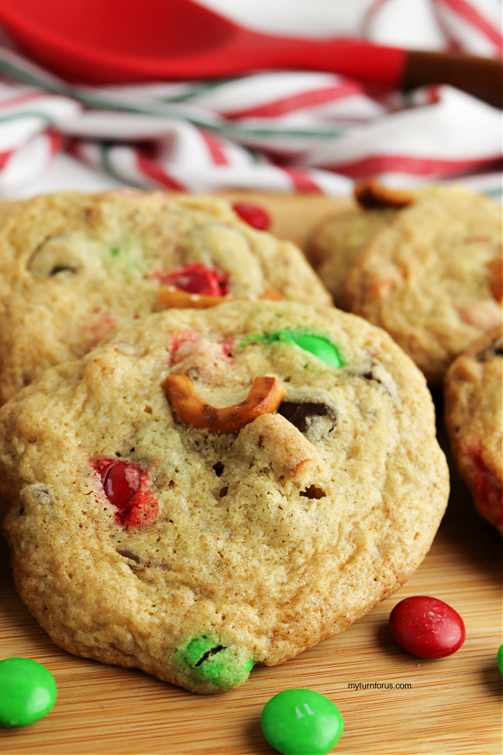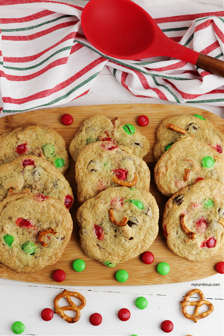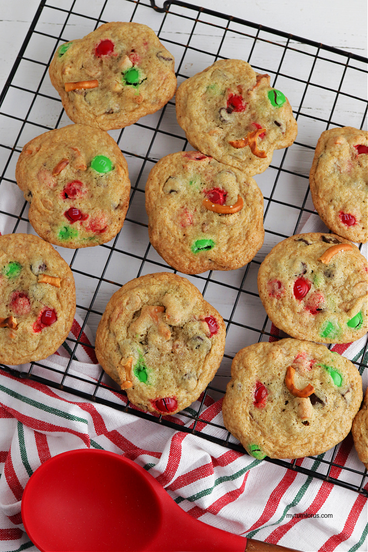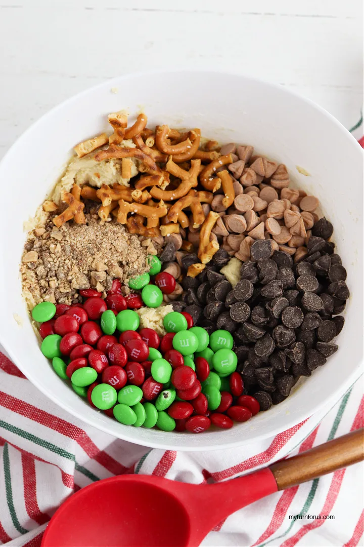Gently fold in the chocolate chips, butterscotch chips, holiday M&Ms, crushed pretzels, and toffee bits until they’re evenly scattered throughout the dough.