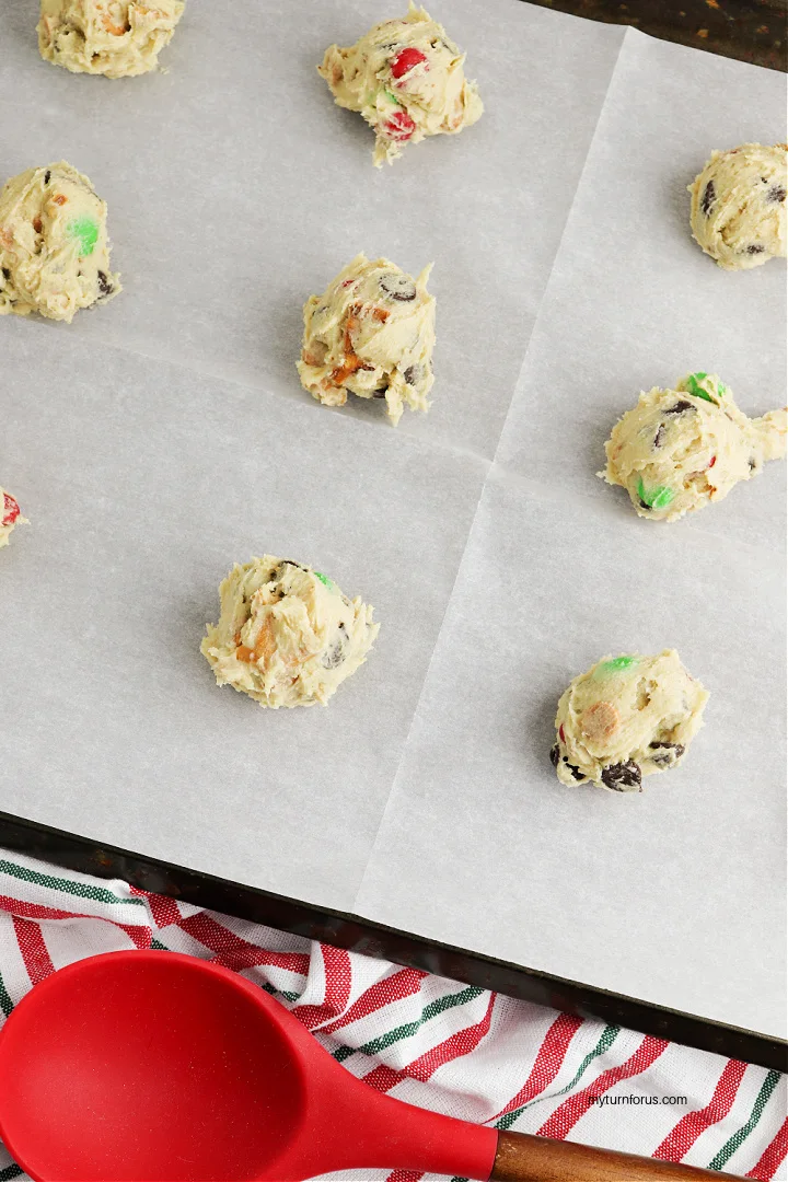 - Use a cookie scoop or tablespoon to scoop the Christmas Kitchen Sink Cookie dough into balls. Place each dough ball onto the parchment lined baking sheet, leaving around 2 inches between each cookie to allow space for spreading.