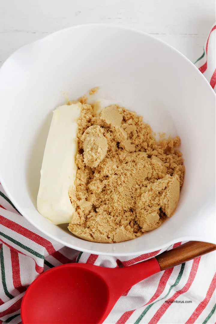 - In a separate bowl, beat together the butter, brown sugar, and sugar until light and fluffy.