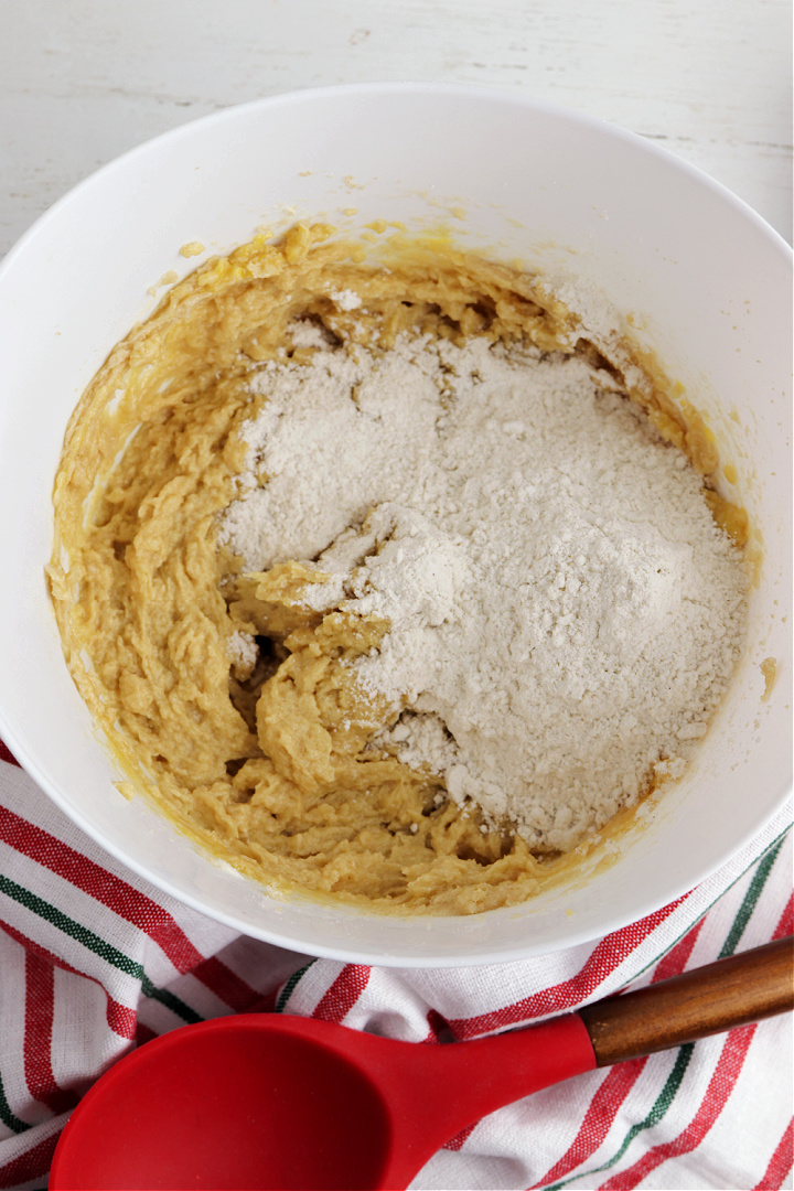 Gradually add the flour mixture into the butter-sugar-egg bowl and beat on low speed just until everything comes together and no dry streaks remain. Don’t over mix.