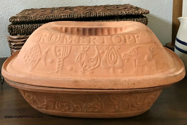 I purchased this Romertopf clay cooker years ago but the only problem we forget we have it for months and months. We bought it when we were on vacation and stumbled upon an old shop, a store in Texas which was called  “Mercantile”, a kind of general store from days gone by.    I knew my mother had a Romertopf clay baker but had never seen one for sale.   Of course, that was before Amazon, where you can find anything.  We purchased it and then began to research how to use it.  Again this was before the internet so it was actually going to the library and search.