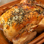 What’s the secret to chicken that’s moist and bursting with flavor? A Romertopf Clay Roaster! Packed with fresh herbs, veggies, and a hearty dose of love, our chicken will leave you craving for more. This Romertopf clay roaster chicken is seasoned with  fresh herbs in butter and veggies such as onion and celery.  If you are looking for a new twist on a classic dish? Look no further! This Clay Pot Chicken recipe will have your taste buds dancing.